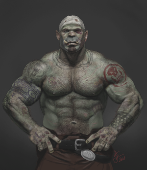 The half-orc was nearly seven feet tall, with grayish skin and dark eyes. He eschewed armor, and his body was covered in scars and elaborate tattoos. His throat had been severely cut at some point, rendering him incapable of speech. He was an accomplished painter.