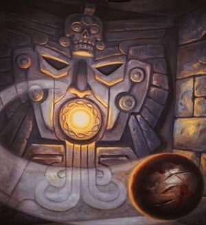 Unnerved by the death of their associate Kalka-Kylla, the Fishwives reentered the tomb and made for Tecuziztecatl's chamber [5]. They found the Lord of the Snails with an odd, greenish glow. He seemed confused and spoke with stunted, repetitious speech. Ka-Ess delved deep into Tecuziztecatl's thoughts, soothing his insanity and returning him to his natural silvery glow. Now convinced that he must help the party, the Lord of the Snails secreted his luminescent goo into three glass vials with instructions to use these in their fight against The Outsider.