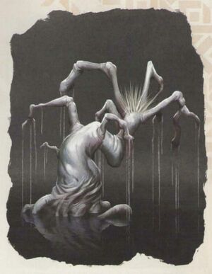 The friends returned to the Diorama Room [1] to find it wetter and slimier than it was during their previous visit. They also noticed bones strewn across the floor and arranged into unnerving patterns which Sathul recognized as pertaining to the Far Realm. In the next hallway [1-2], the bamboo decorations on the walls could be seen shifting into script, but only when not looked at directly.