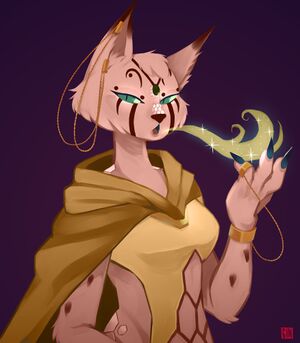 Has a sick staff made of a bronze colored wood inscribed with faint ruins. A large yellow gem is fixed on the top by what looks like a bronze cat’s paw.