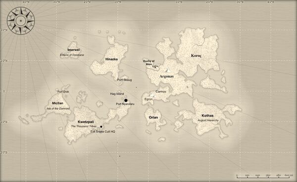 The wild continent of Hinazka was largely uninhabited, with the notable exception of the island city-state Port Skaug at its southern tip. At some point prior to 218 V.II, Hag Island reappeared in the island chain between Hinazka and eastern Kwetzpali.