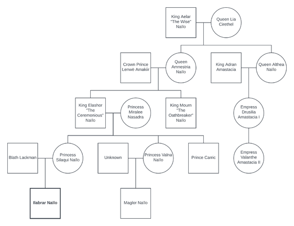 Ilabrar was a direct descendant of King Aelar "The Wise" Naïlo and Queen Lia Cirethel and heir to the Kingdom of Nindrol. Though this was unknown to him until later in life, his cousin Maglor Naïlo was born at the exact same time as he, which meant that each had a claim to the throne.