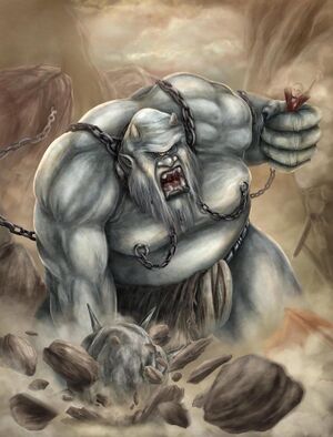 Kronk was a cyclops who inhabited a cave on Hag Island. He was approximately twelve feet tall with gray-brown skin that camouflaged him against the rocks of his cliffside home. He wore an enormous iron chain around his neck and a loincloth of goatskin. He became a steadfast ally of the Fishwives after they performed for him various feats of magic.