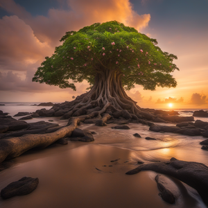 On an island in the port town's lagoon, an expansive kapok tree's roots covered the crumbling foundation of a temple to the tabaxi creator god.